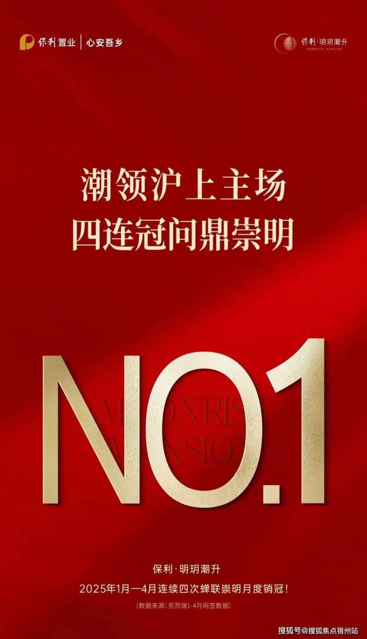 2025年1月至4月,保利·明玥潮升以成交面积5314㎡、成交金额超 1.7亿元 的傲人成绩, 连续四个月稳居上海崇明市场销售榜首 ! 认购套数、认购面积双双名列崇明住宅销量TOP1 (数据源自克而瑞1-4月网签数据), 排名持续稳居第一!