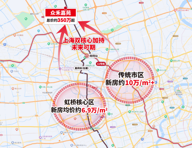 在南翔换乘11号线后,还可以直达包括真如、静安、徐家汇 等传统市区。