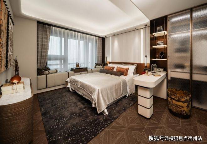 吊顶采用 一体化大平顶加回型吊顶设计,并且在四个角均匀做了 圆弧处理,让整个空间感更加和谐圆润。