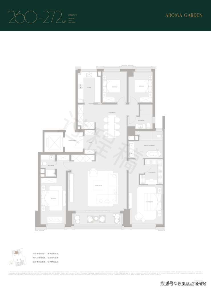 建面约260/272㎡,南向双套房,尤其主卧是豪华套房,带独立衣帽间,卫浴间含双台盆+淋浴+浴缸+马桶四件套。