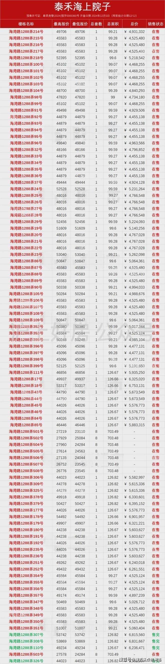 根据公示,泰禾海上院子已经于2024年7月4日取得预售许可证至今分三次开盘销售,总套数591套,已售315套。泰禾海上院子售楼处电话☎:400-8266-670✅✅剩余276套在售(信息来源上海房地产信息网)三批次6月27号取证,目前可以直接认购。泰禾海上院子售楼处电话☎:400-8266-670✅✅