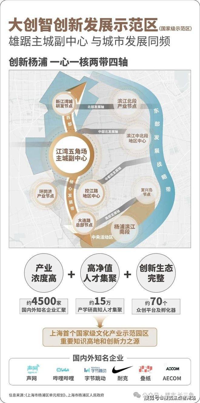 江湾五角场和新江湾城共同构建了大创智创新发展示范区。形成了世界级的产业集群,是“产业浓度、人才浓度、创新生态” 兼具的创新功能聚集区。