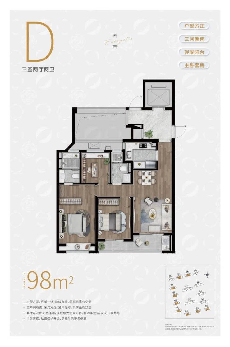 D户型:建面约98㎡3房2厅2卫▼
