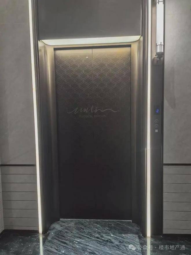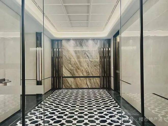 单元门厅是龟背+铜钱纹的大理石拼花,墙面还有一整面的岩板背景墙;天花板还是金属线条的弧形吊顶+造型花纹,配合暖色灯带照耀,归家仪式感瞬间再上一个台阶