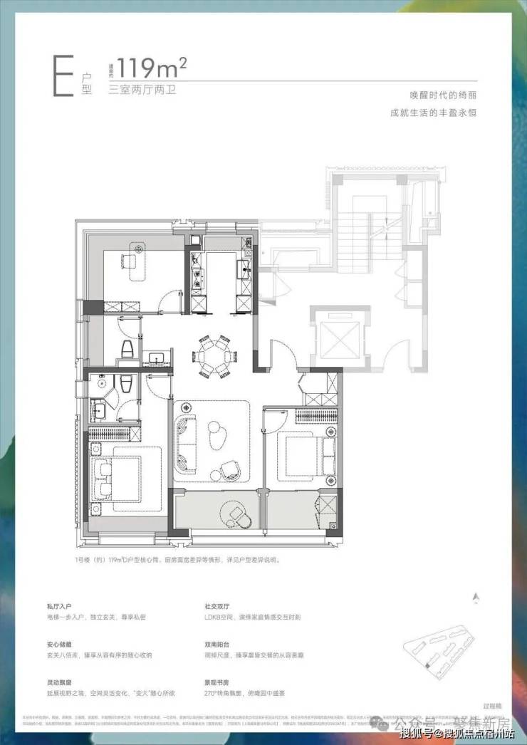 建面约119㎡户型:双阳台, 所有户型自带入户私厅,哪怕是少量一梯两户的楼栋,也是电梯对开,也给你留出了尊崇的仪式感。