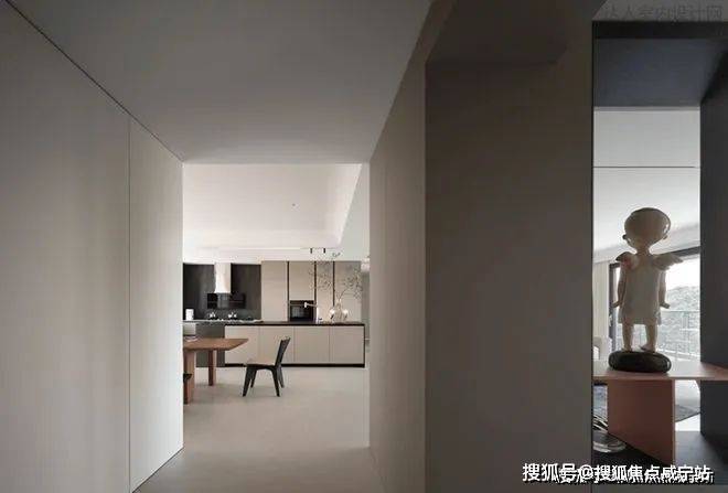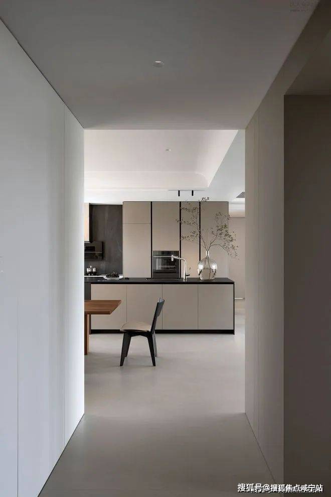 空间里,客餐厅的界限消融,整个平面铺展开来。每一寸空间都透露着极简与克制的气息,同时又坚定不移地展现着居住者的独特个性。墙壁上的抽象画作,或许难以被世人理解,但它们与家的相依相伴,将见证每一次的选择与热爱。