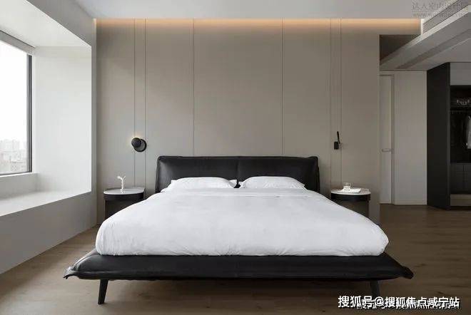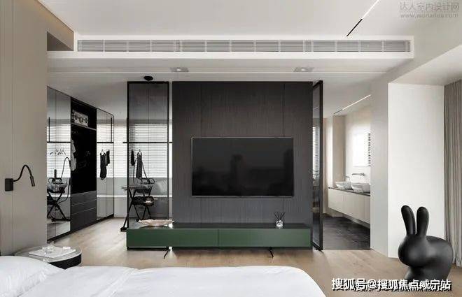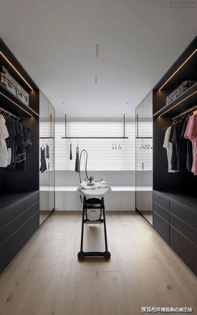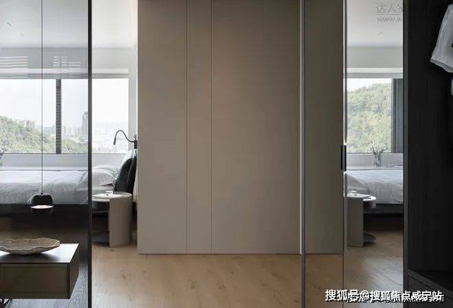 更衣间与沐浴区是轻奢卧室的标配,深棕色的隔断巧妙界定了适宜的私密空间,同时在视觉上模糊了两个功能区间隐约的分界。