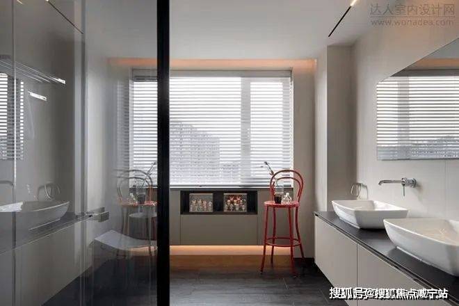 在素色的浴室中,热情如火的红色座椅与台灯一静一动相互照应,熏香烛台让空间多了几分雅静。