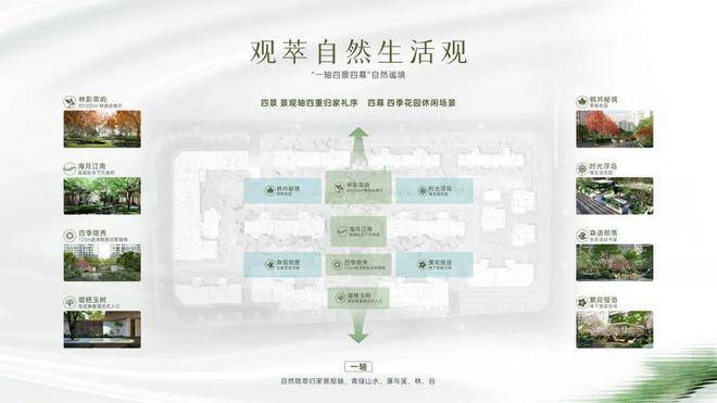 高定酒店式入口进入,便是 约120米进深的自然隐萃归家景观轴,串联 “四重萃隐景观”、“四幕花园谧境”