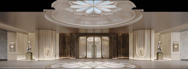 项目以长达280米的贝克米白石材门庭为序,过渡至70米私享厅堂,打造上海首个“中央车站”风格的星级酒店式门厅。