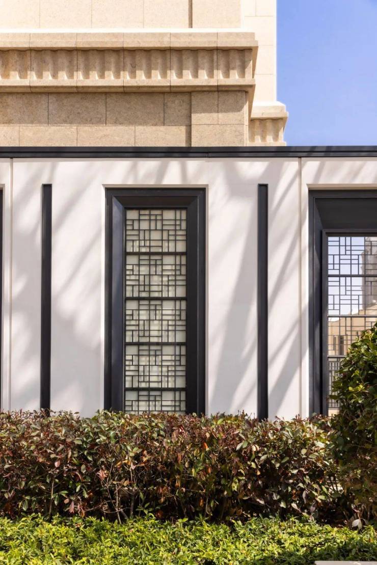 再来看公区,庭院的格栅,同样做了造型化处理,镂空形状不一,随着日光位置的变化,阳光洒落,造型十分灵动。