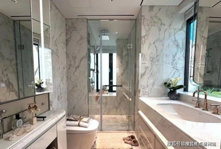 收纳细节上,二期户型中完美继承了一期的收纳系统,玄关收纳,整面内嵌柜体一直延伸到餐边柜;厨房全屋定制的柜体;卫浴的镜面柜和美妆冰箱等等,主卧卫生间的进一步升级:洗手台与化妆台相对,拥有三面镜柜,视觉空间进一步扩展和延伸。