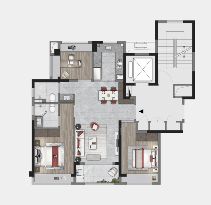 飞机户型设计,减少了非功能区如走廊、拐角的面积。凭借高空间利用率,让家的空间体验“变大”。