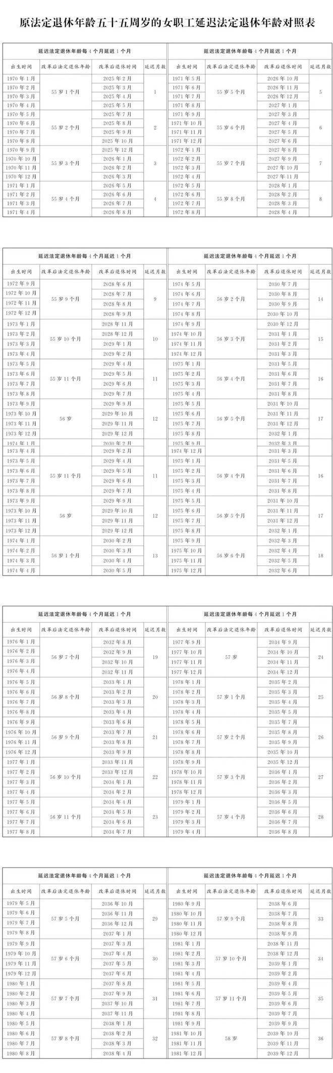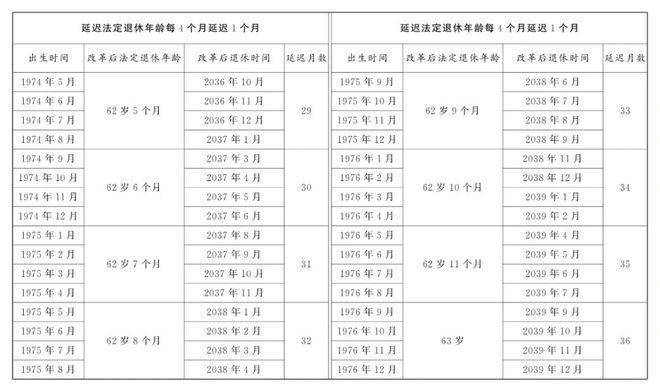 2025年1月1日起,原法定退休年龄为60周岁的男职工和原法定退休年龄为55周岁管理、技术岗位的女职工,法定退休年龄每四个月延迟一个月,分别逐步延迟至63周岁和58周岁;原法定退休年龄为50周岁工人岗位的女职工(不包括事业单位在编的干部身份的女职工),法定退休年龄每二个月延迟一个月,逐步延迟至55周岁。