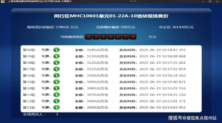 6月19日,闵行1幅地块出让,地块名称为颛桥镇MHC10601单元01-22A-10地块,规划用地性质为住宅用地,出让面积4.05公顷,容积率为2。经过40轮竞拍,最终由上海保利城市发展有限公司竞得,总成交价314026万元,溢价率12.95%。