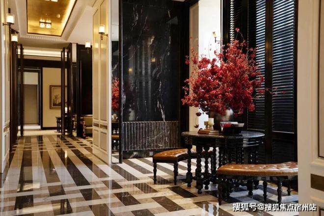 矗立两旁的是进口奢石巴西乌金石打造的大理石柱,庄重典雅。点缀画面中央的是玻利维亚蓝,这是世界上储存量极少的石材之一,被称为奢石中的劳斯莱斯。地面的拼花灵感来自伦敦瑰丽酒店,黑白相间,给我一种神秘厚重的感觉。建发·海阅首府售楼处电话:400-8894-638(一对一解答,欢迎咨询)