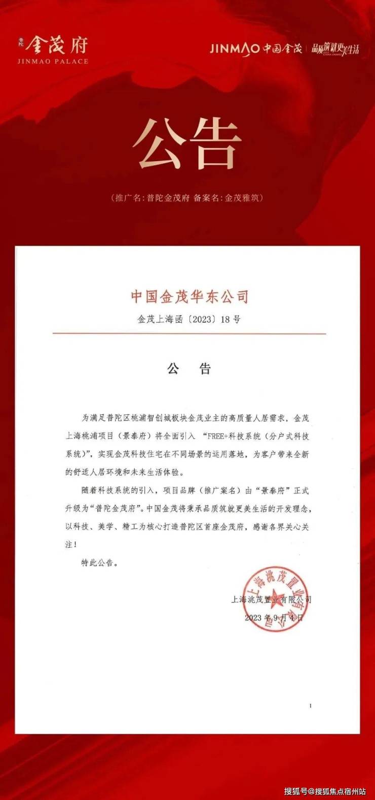 2023年9月4日,中国金茂华东公司发布一则公告:金茂上海桃浦项目(景泰府)更名为普陀金茂府。
