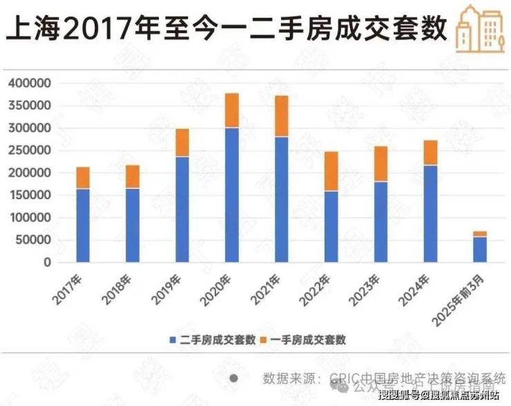 CRIC数据显示,2017年至今,上海一二手房成交套数的比值一直在1:3左右,也就是说每卖1套一手房就有3套二手房成交。从成交套数来看,二手房占据绝大多数。与此同时,虽然一手房经常出现较高成交价格,但上海二手房套均总价一直在300多万元/套,2025年一季度上海二手房套均总价为352.56万元/套。