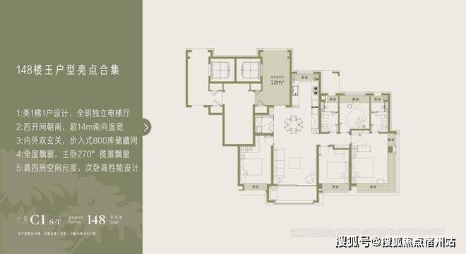 建筑面积约148㎡阔尺四房:高阶改善的奢居范本:类1梯1户设计,全明独立电梯厅营造归家仪式感;近14米南向面宽+四开间朝南,餐客厅一体化社交空间贯通景观阳台;内外双玄关+步入式储藏间,解决收纳痛点;主卧套房配270°揽景飘窗,沉浸式享受滨江奢居体验,满足高净值家庭的品质需求。