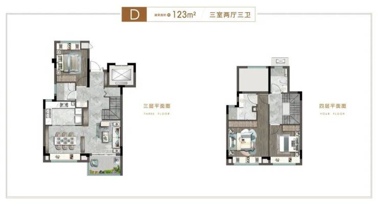 约123平上叠3房户型,共上下两层,全明设计,格局开阔,宽景阳台,上承天空,下承生活。