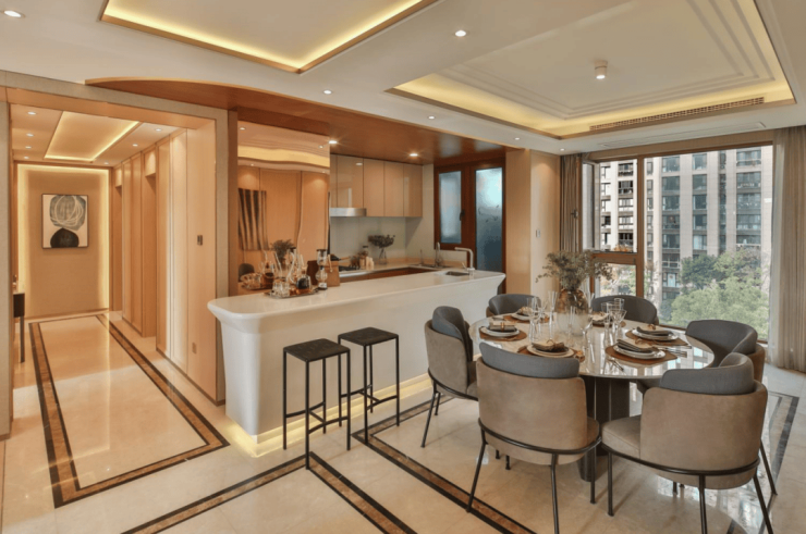 厨房做了U字型敞开式厨房,与餐厅无缝对接,提高室内空间及烹饪用餐的家庭氛围。☑️☑️中环名品公馆售楼处电话:400-1183-605☑️☑️