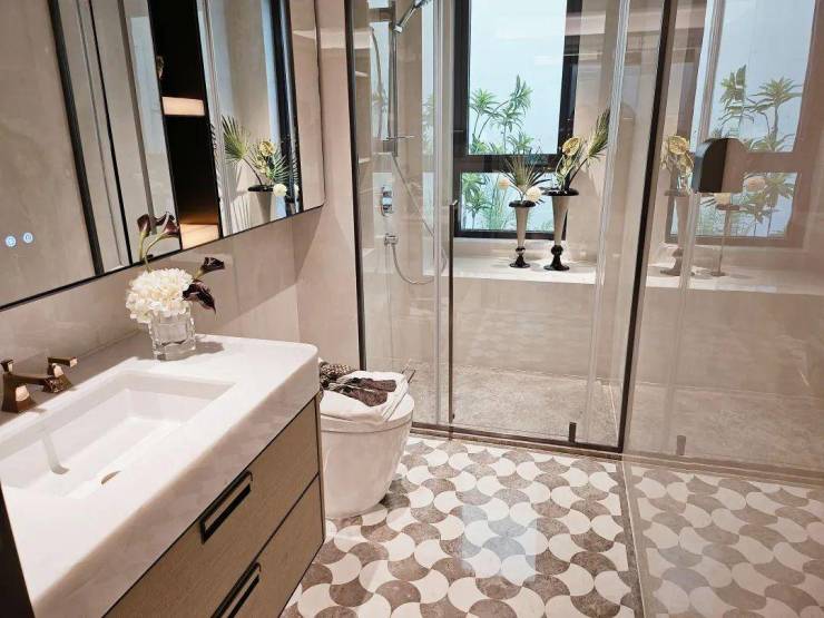 奢石台面,皮革饰面柜抽屉,侧端设置金属收纳开放格;定制镜柜,中间的透光玉石直接提升了高级感,镜柜内部配备了美妆冰箱+美妆灯条+轨道收纳!✅海上清和玺售楼处电话:400-833-6309(官方售楼处电话)