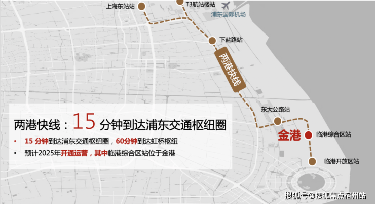 今后,配合金港TOD大城项目的开发节奏,从金港所在临港综合区站出发,3站到达浦东国际机场T3航站楼和上海东站到浦东枢纽,机场联络线3站到张江,轻松与城市核心区、与世界接轨,对内,坐拥中运量T2/T5,形成15分钟公交网联通金港,通达临港其他组团,从某种意义上来说,金港甚至比临港核心区更具交通便利性。