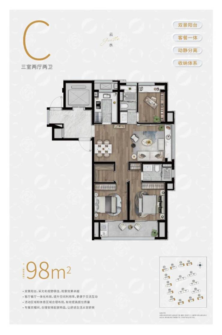 约98㎡3房2卫户型,三开间朝南,并且这贯穿客厅+次卧的超大阳台实在是惹眼,这个南向的视野延展度以及采光度相比同级别的户型来说,要更加出色。