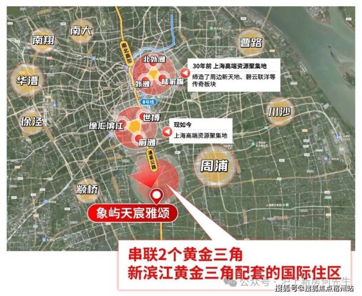 众所周知,项目高端城市资源高度集中在2大滨江黄金三角:由外滩-陆家嘴-北外滩构成的传统中央商务区,由前滩-徐汇滨江-世博构成的新兴中央活动区。其他所有板块几乎都是经由它的价值辐射。换言之,谁距离他们更近通勤更快谁就更有未来!