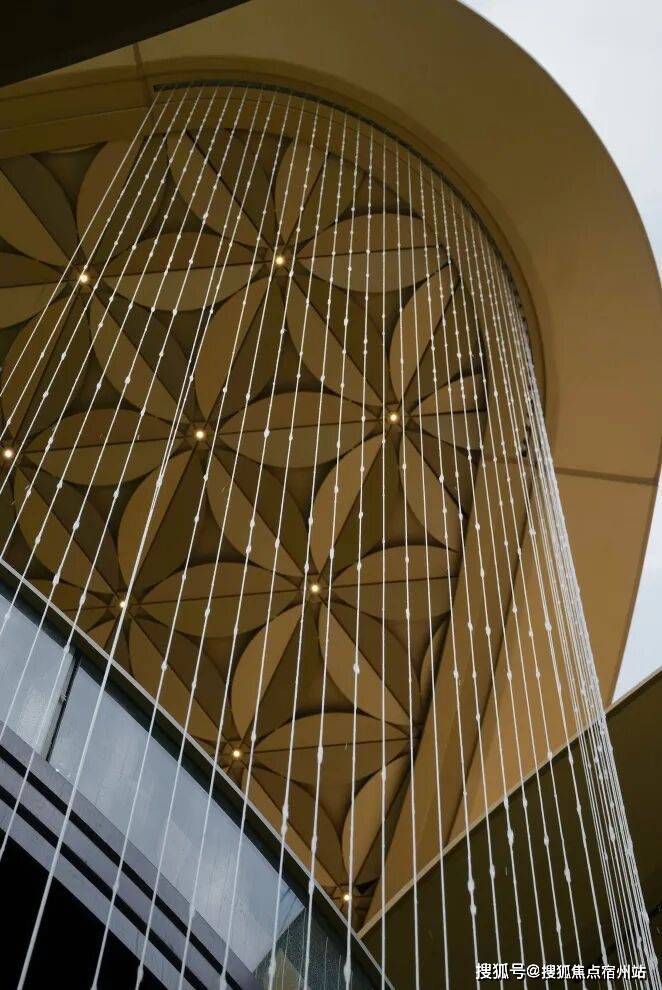 用「浮岛」元素的立柱撑在门口,顶部做了500多片的镂空透光铝板雕花花瓣。