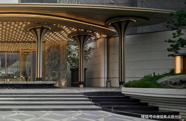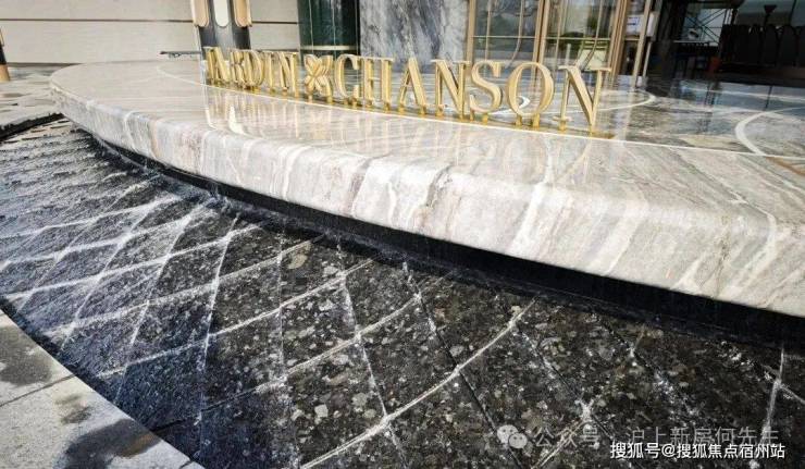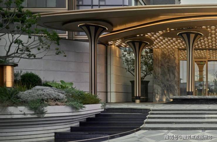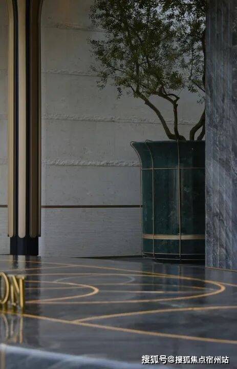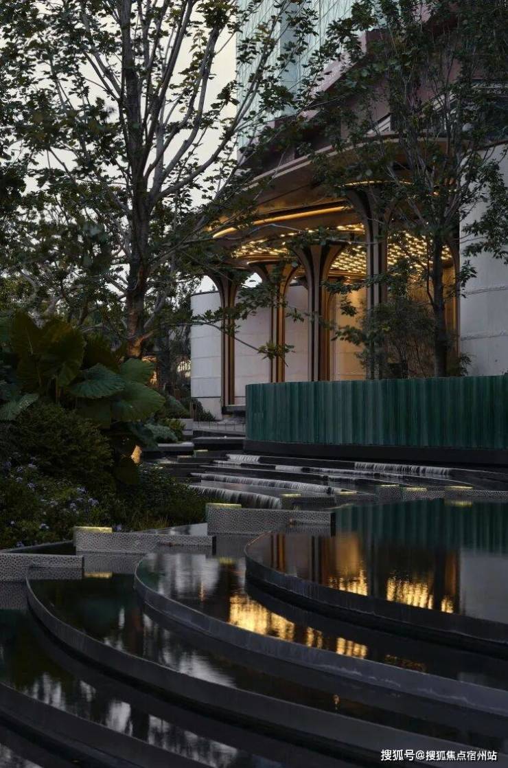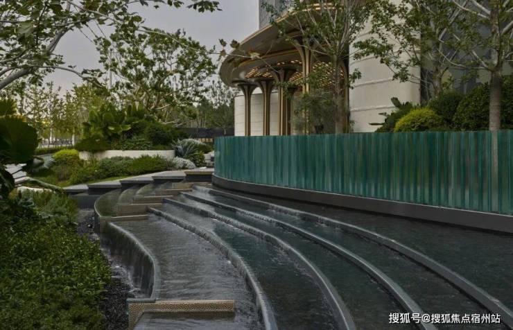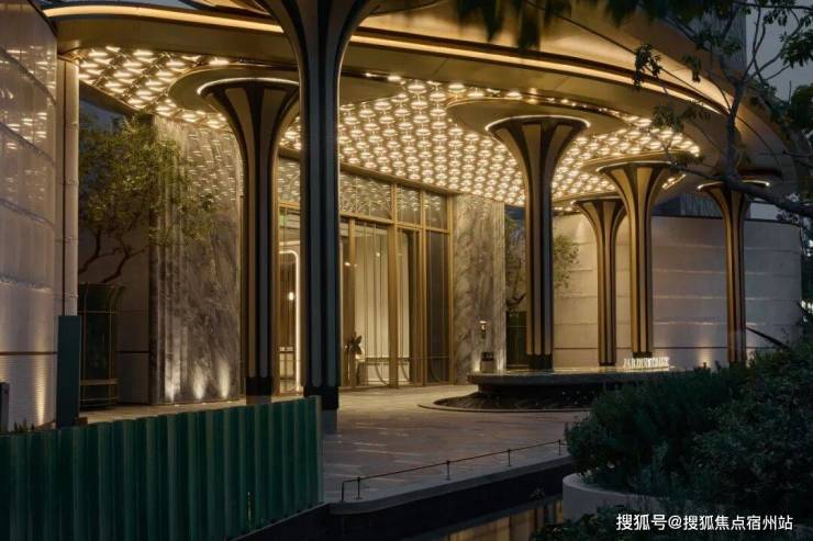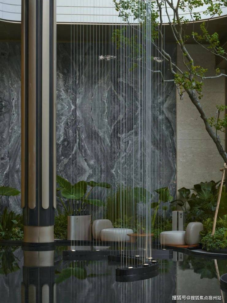 大门口的水景采用了龙鳞水纹的造型。在现场,会有种身处顶奢酒店入户大堂的观感。
