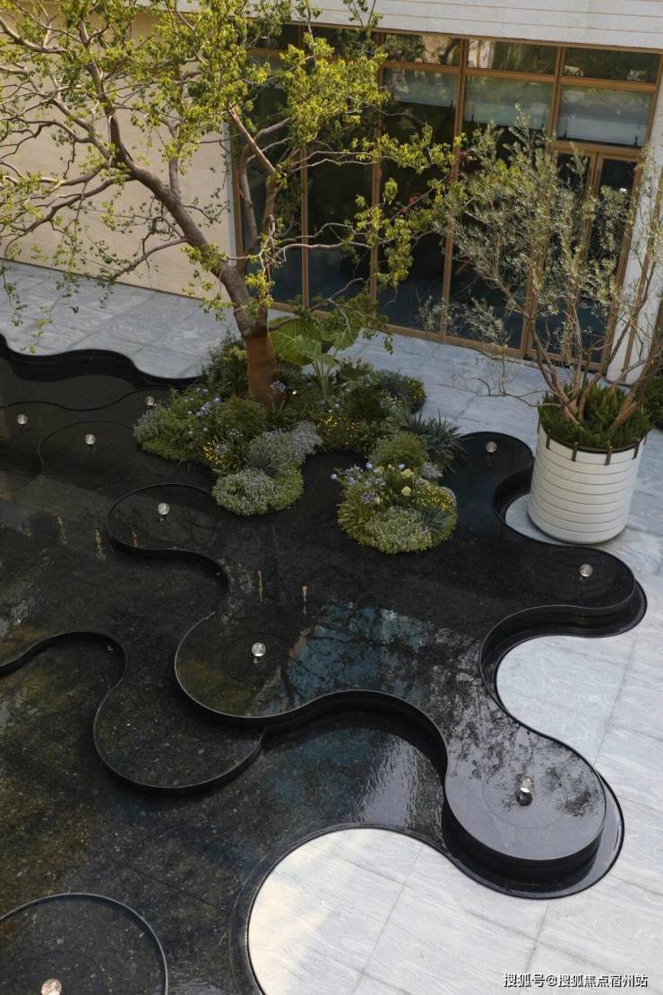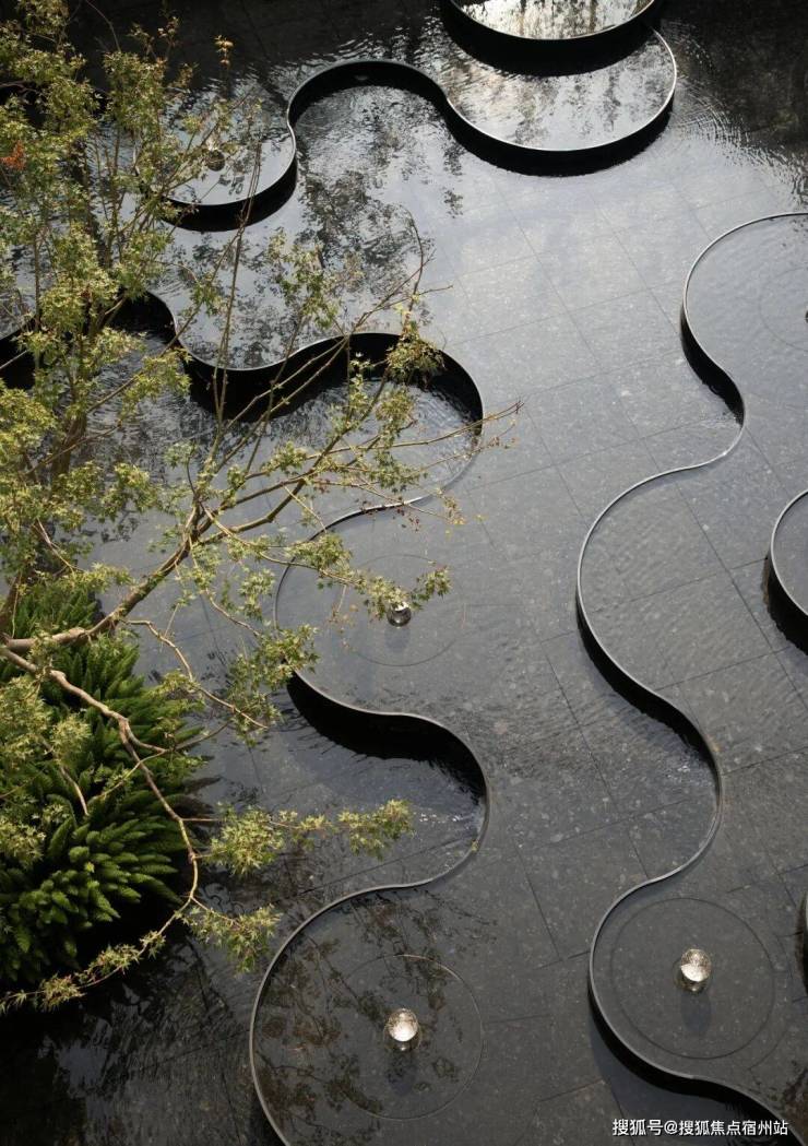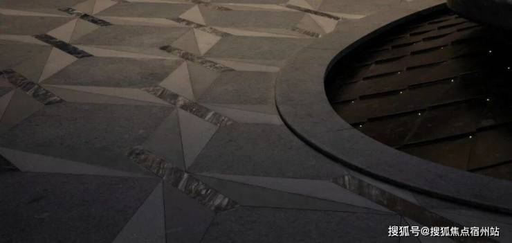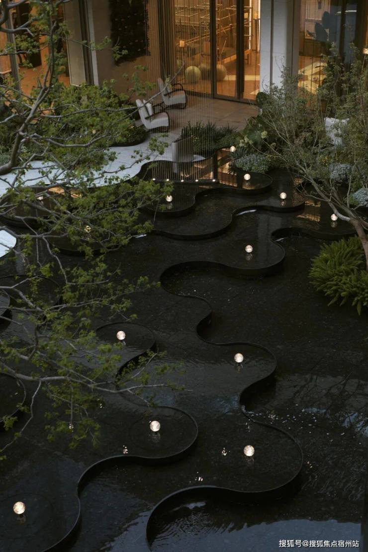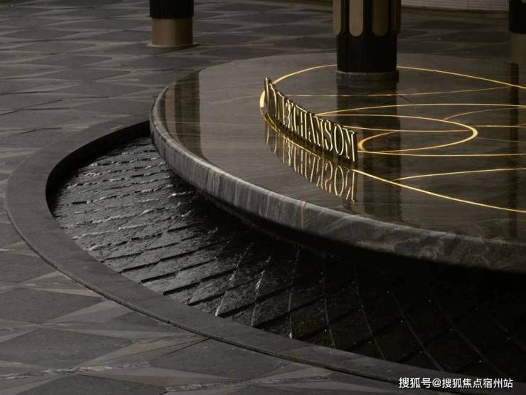 “艺术定制水盘”静卧于场地中央。威尼斯棕与云石板材交错铺陈,沉稳且灵动。菱纹水面捕捉光的轨迹,如星光流转,在昼夜交替间折射出内敛而璀璨的光芒。
