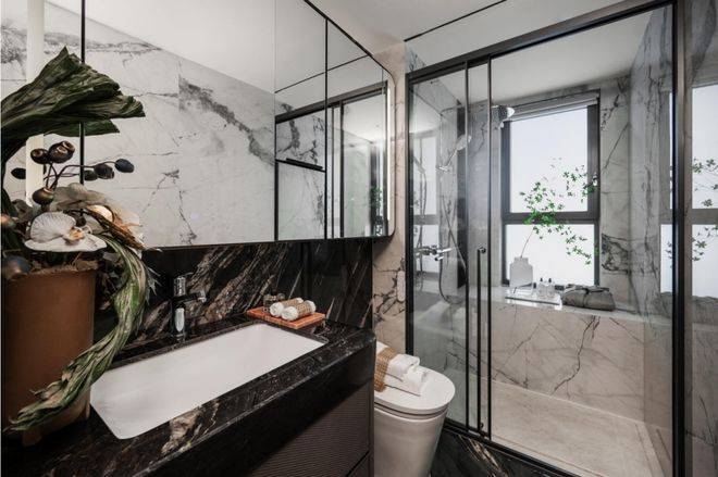 卫浴墙面采用寒江雪大瓷砖铺装,淋浴部分地面选用整块天然大理石