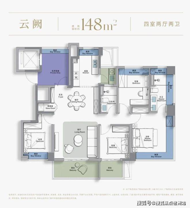 而建面约148㎡“云阙”户型,则是西派云间立下的 “改善旗舰” 。它集四大创新于一身:四开间朝南、三阳台功能分区、边套270°环景飘窗、一梯一户阳光梯厅。其LDKB一体化空间形成了约34㎡的超大会客厅,搭配约3.05米的层高,空间气场直逼大平层。边套主卧的270°环景飘窗,采用造价更高的大尺寸玻璃,将视野与采光最大化,晨起赏朝阳、夜晚观繁星成为日常。从入户开始的墅级收纳系统,到功能分明、动线高效的U型厨房,再到兼具衣帽间和全明主卫的“全景休憩舱”式主卧,每一个细节都在诠释何为“奢宅尺度”。