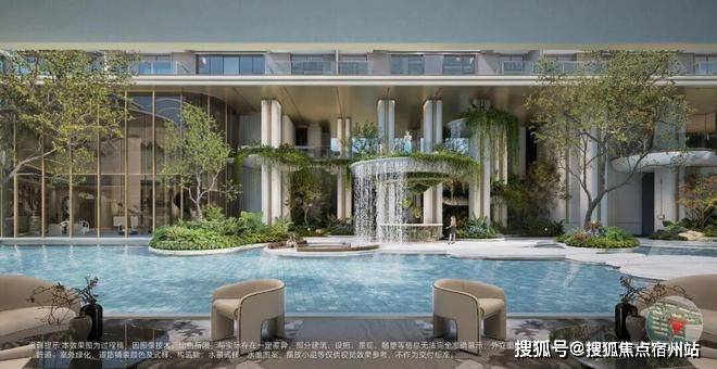 步入社区,首先会震撼于约1600㎡下沉式水院。这里不是一潭静水,而是一个充满生命律动的微缩自然系统。中心是约1200㎡的超大镜面水景,池底铺设蓝水晶岩板,映照着天光云影。夺人心魄的,是环绕水景的 “云间三瀑”——三座形态、规模、声势各不相同的大型瀑布系统:有从约10米高处倾泻而下、形成环绕式水幕的大瀑帘;有由多层云盘叠级、如云间落玉盘的中型叠瀑;更有从会所泳池上空吐出的、宽达6米的凌空瀑涌。三瀑共鸣,构成一场沉浸式视听盛宴。