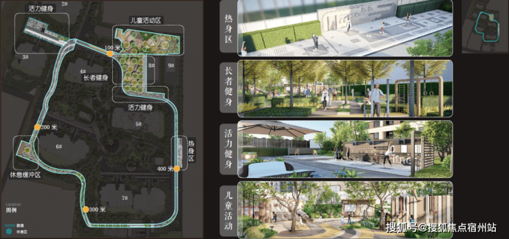 五大运动活力系统 :热身区、定制主题儿童活动区、老年健身区、活力健身区和休憩缓冲区,并由约400M跑道串联;