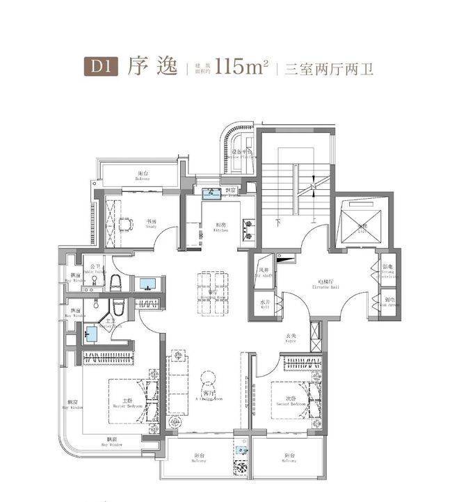 750万级115㎡鲲鹏阁三房户型