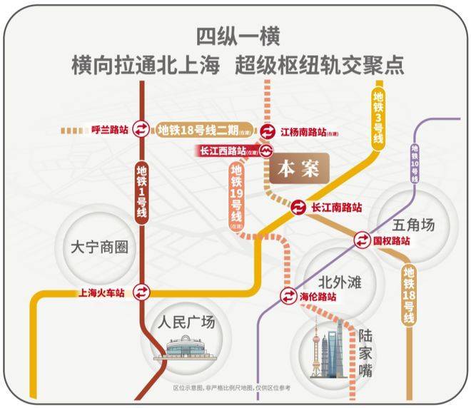 项目紧邻长江西路地铁站(在建),直线距离仅200米(北门至地铁站)地铁18号线横向拉通了原本纵向不相连的四线地铁(1/3/18/19),将北上海横向联通,成为区域轨交的交汇聚点。1站江杨南路,5站复旦,7站五角场,让您快速抵达城市的各个核心区域,畅享便捷的都市生活。