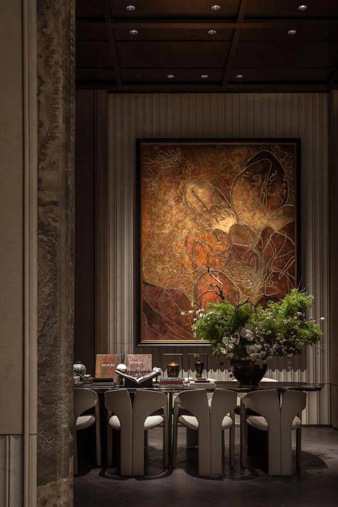 王府规制的通高大门,镶嵌昂贵天然水墨玉,自然天成的“山水画”,传递“玉出东方,门纳乾坤”的美好寓意;会客区域非遗艺术家画作《繁花映春》,耗时3月而成,诠释历久弥新的艺术价值。