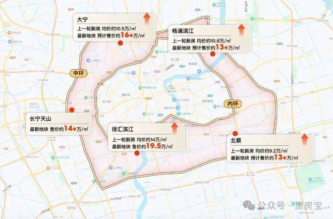 目前上海内中环新房的预计售价(按地价与成本测算仅供参考,以开发商官宣为准)全线超过13万/㎡,大宁预计16万/㎡,徐汇滨江更是站稳19.5万/㎡。