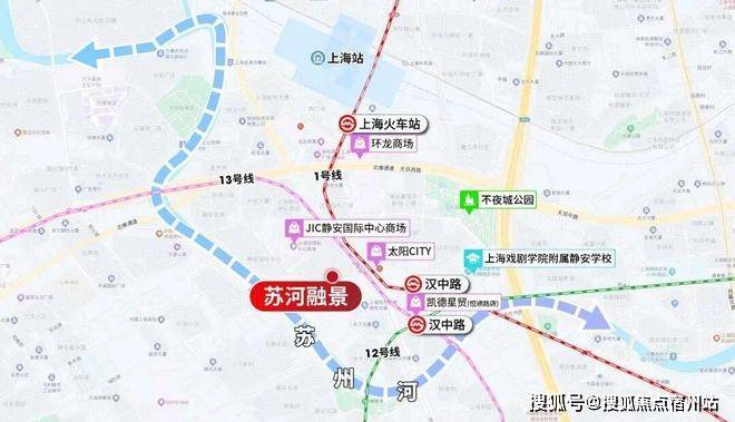落位到具体交通,苏河融景步行可达(约200米)城心无比重要的十字交错站点——1/12/13号线汉中路站,进站后2站人民广场,2站南京西路、2站北外滩。