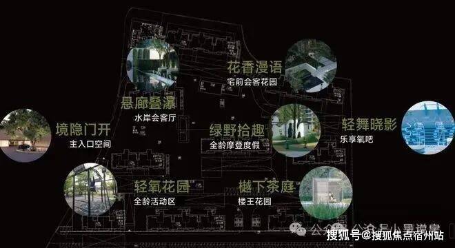 还能在归家的动线上体会到不同的景观节点:境隐门开(主入口空间)、悬廊叠瀑(水岸会客厅)、绿野拾趣(儿童乐园)、轻舞晓影(乐享氧吧)、樾下茶庭(宅前花园)、花香漫语(宅前会客花园)、轻氧花园(全龄活动区)。