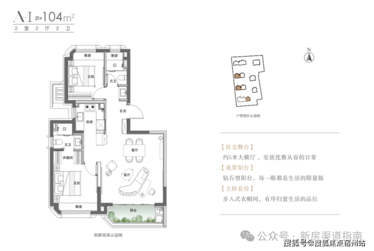 建面约104㎡的两房两厅两卫是舒适的大两房设计,主要分布于小区西侧和头排,视野相当出众。