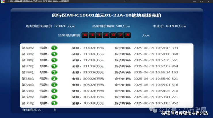 6月19日,闵行1幅地块出让,地块名称为颛桥镇MHC10601单元01-22A-10地块,规划用地性质为住宅用地,出让面积4.05公顷,容积率为2。经过40轮竞拍,最终由上海保利城市发展有限公司竞得,总成交价314026万元,溢价率12.95%。