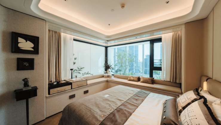 再来看看134㎡3室2厅2卫样板房。比起112㎡户型,这个客厅要宽敞很多,岛台也可以做成独立样式,摆放6人长桌也绰绰有余。主卧采用270度拐角飘窗设计,采光面拉满。