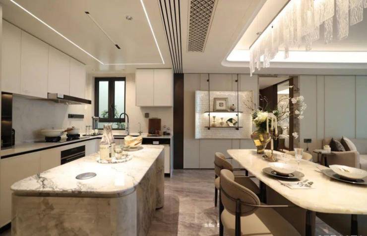 来到建面约112㎡3房2厅2卫样板房,设计主打海派风格,开放式厨房和西餐岛台,卫生间地面拼花,石材台面镀金龙头。标准的三开间户型,设计上将传统的过道改为餐厅空间,将公共区域做大了。