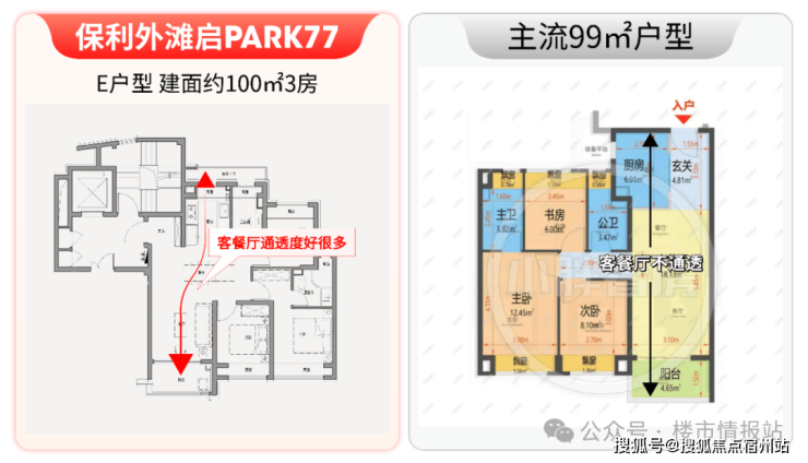 当下市场,入门三房面积正大幅扩容,普遍达到108-110㎡,甚至直接跃升至120㎡。而保利外滩启PARK77 建面约99-102㎡3房,堪称市中心最后一批“百平米三房”,一旦错过,购房成本将直接增加100多万!