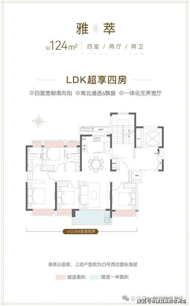 来看看更大一点的户型——建面约124㎡四房,同样是飞机户型设计,并拉伸至4开间,南向整体约12.8米面宽,空间感和舒适度拿捏到位。