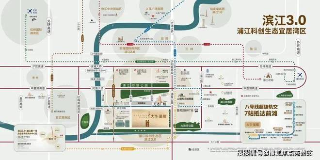 项目距离浦江线汇臻路站约1.3KM,5站即达沈杜公路站并与8号线换乘,可一线直达前滩。或通过BRT快线可一站无缝对接8号线沈杜公路!