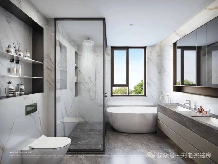 第二,3间套房的设计能满足各个家庭成员的隐私。尤其是主卧,尺度超大,并配置了双台盆+浴缸+淋浴+马桶豪华四件套,还有超大步入式衣帽间。